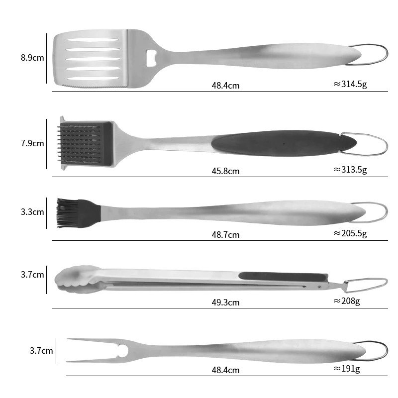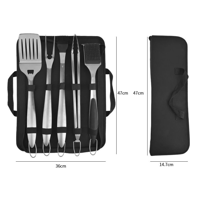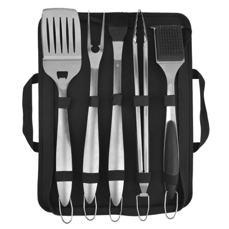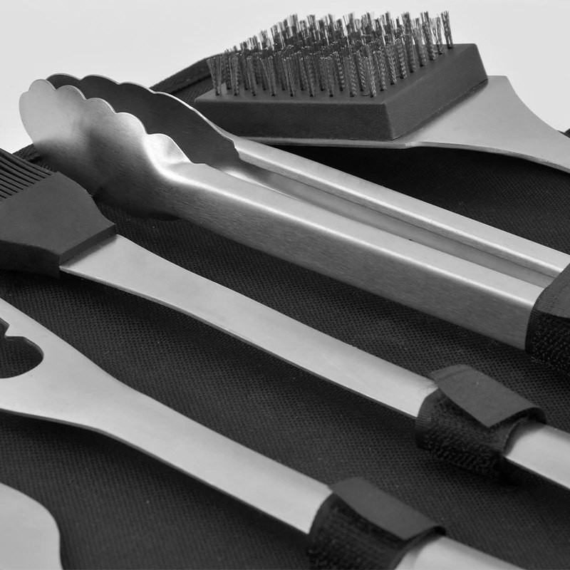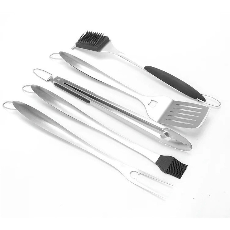 Этот набор для гриля и барбекю состоит из пяти базовых инструментов. удобно размещенных в крепком черном футляре с ручками. Такая комплектация обеспечивает комфортное хранение, транспортировку и защиту инструментов от повреждений и загрязнений.
