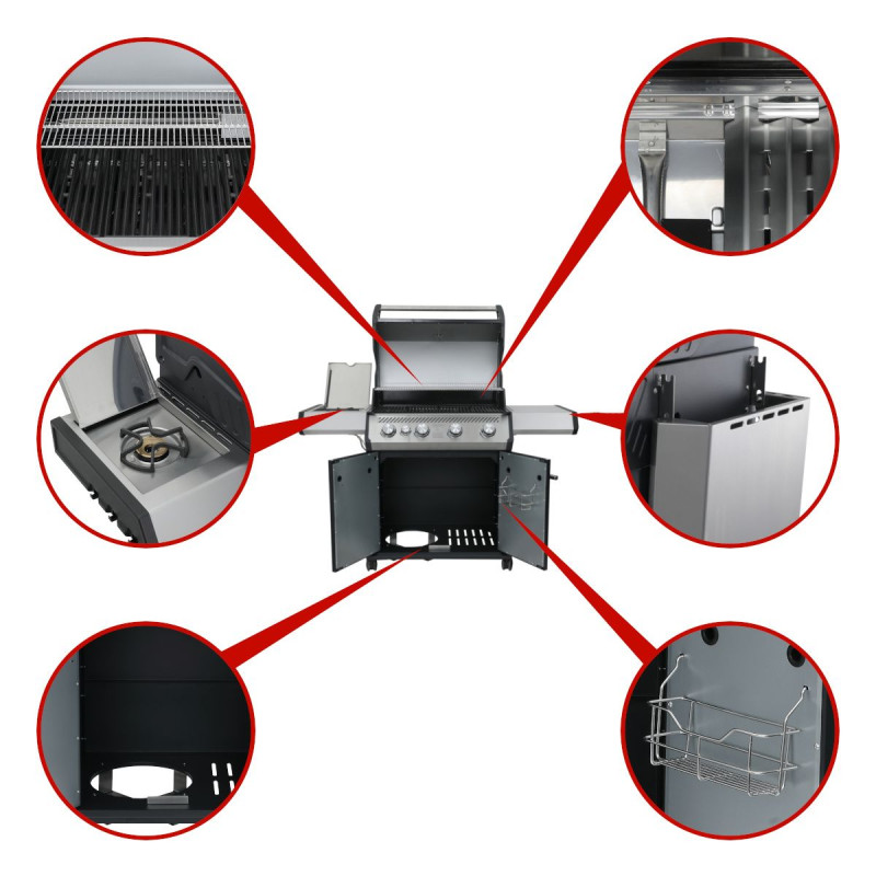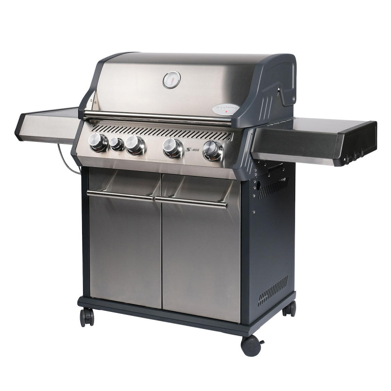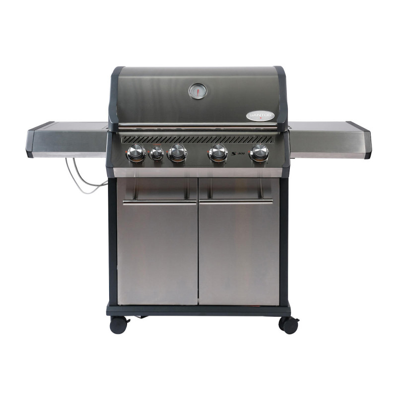 Газовый гриль SANTOS S-401 выполнен в корпусе из нержавеющей стали и оснащен боковыми столиками для максимального удобства. Большая зона приготовления, 4 основные горелки и дополнительная горелка в боковом столике позволяют легко готовить блюда для компании из 8–12 человек и реализовывать практически любые рецепты BBQ.