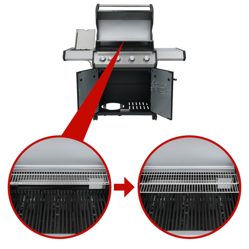 Выдвижная полка позволяет поддерживать блюда горячими или готовить на косвенном жару. При необходимости ее можно увеличить или снять.