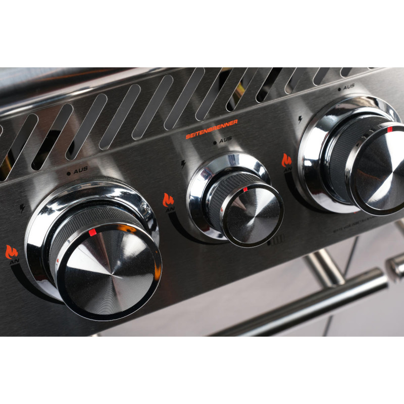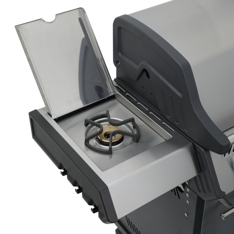 Левый столик оснащен горелкой мощностью 4 кВт, которая позволяет готовить соусы, гарниры или кипятить воду. Это позволяет одновременно использовать основную камеру гриля и дополнительную конфорку.
