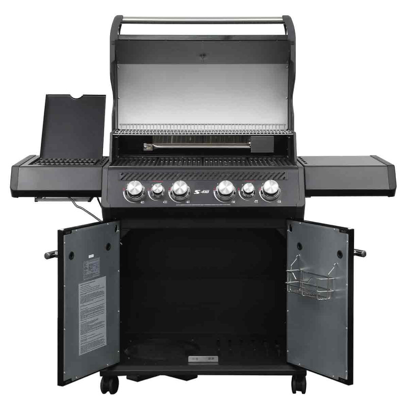 Рабочая поверхность имеет около 3208см² (приблизительно 42,5×75,5см), что позволяет одновременно готовить блюда для 8-12 человек. Гриль также оснащен складным боковым столиком с крючками для аксессуаров – так все необходимо всегда под рукой. Колеса обеспечивают простое перемещение оборудования по площадке. Газовый гриль SANTOS S‑418 All Black – стильный и мощный гриль для настоящих ценителей барбекю! Создан для тех, кто любит не просто готовить, а творить кулинарные шедевры прямо на открытом воздухе. Этот гриль сочетает элегантный черный матовый дизайн и широкий спектр функций, делающих его незаменимым во время семейных ужинов, дружеских встреч или праздничных пикников.