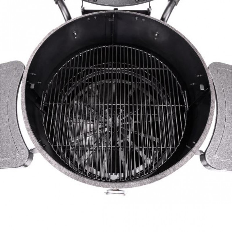 Угольный смокер Pit Boss Champion имеет 3 яруса стальных решеток с фарфоровым покрытием, обеспечивающих поверхность для приготовления площадью более 7742 см². Устройство имеет большую емкость для подвешивания с трехъярусной стойкой, которая может вместить до 12 ребер за один сеанс приготовления.