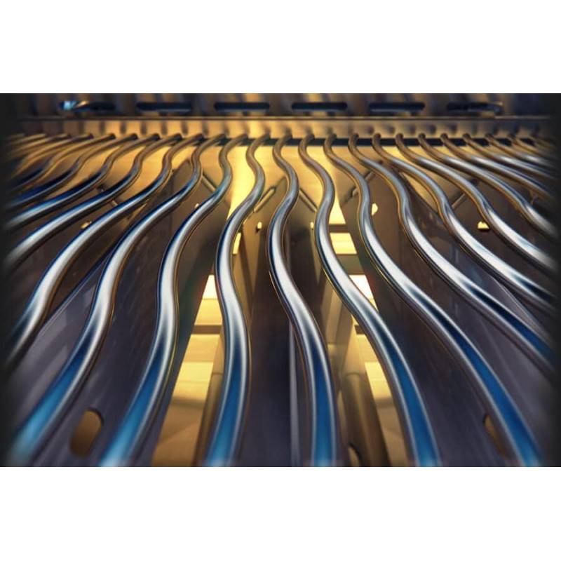 Гриль оснащен 5 основными горелками и инфракрасной задней горелкой, которая идеально подходит для приготовления на вертеле — мясо получается сочным внутри и с хрустящей корочкой снаружи. Фирменные волнистые решетки обеспечивают равномерное прокаливание, а система быстрого зажигания позволяет мгновенно запускать гриль. Подсветка ручек придает комфорт при использовании в вечернее время.