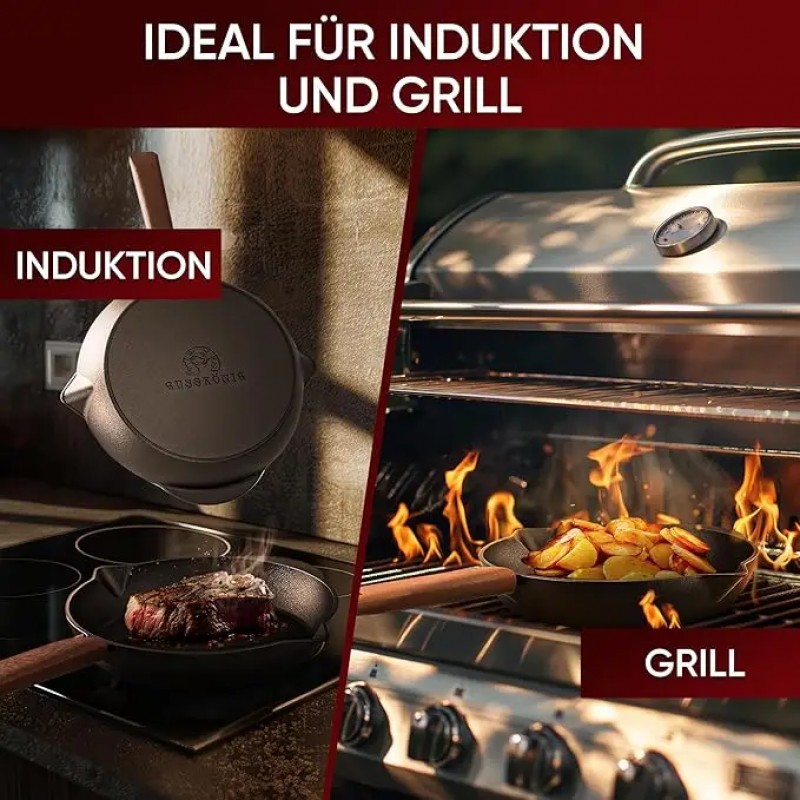 - Термостойкость до 300°C Чугунная сковорода Gusskönig выдерживает температуру до 300°C без деформации, что делает ее надежной для любых кулинарных вызовов.