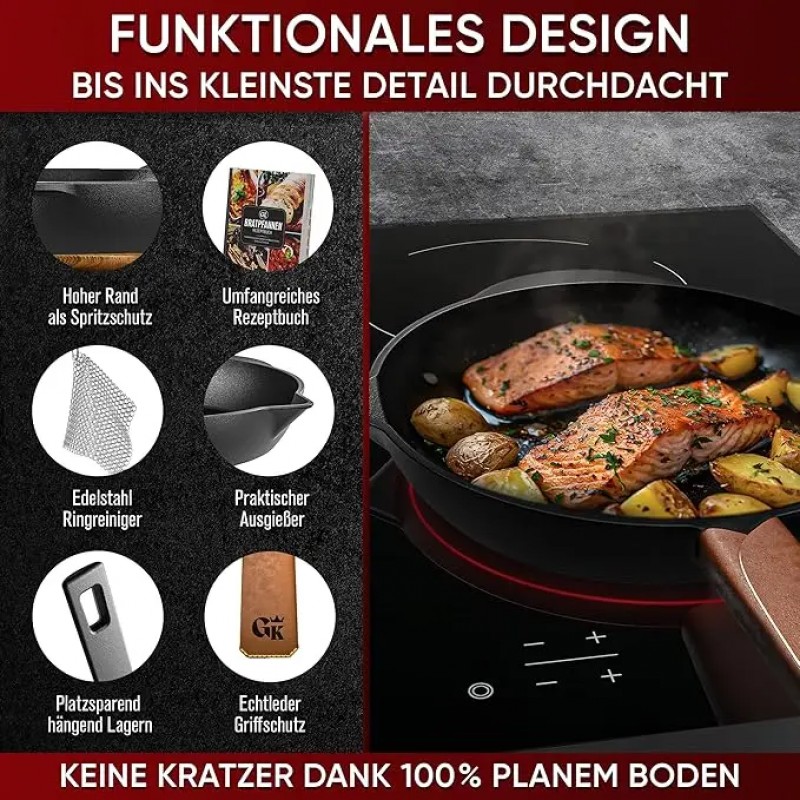 Чугунная сковорода Gusskönig 26 см + книга рецептов, очиститель, кожаная накладка - 170097