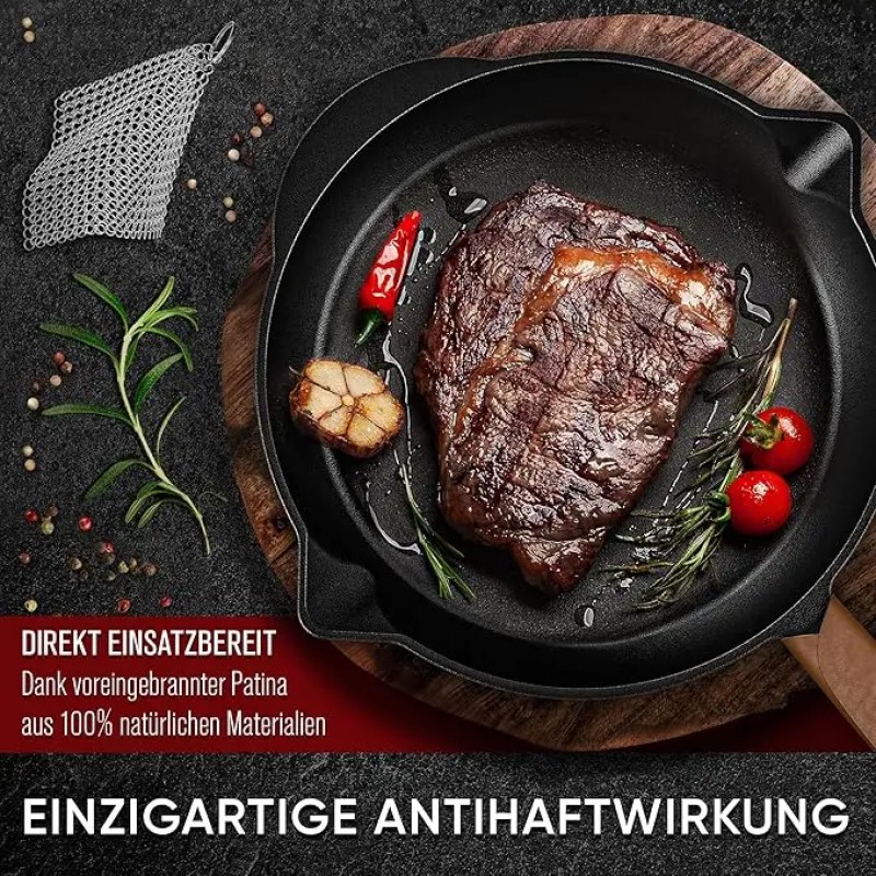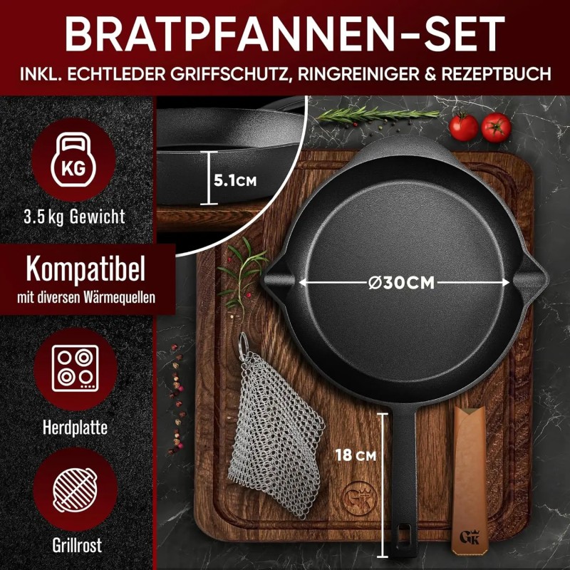 - Термостойкость до 300°C Чугунная сковорода Gusskönig выдерживает температуру до 300°C без деформации, что делает ее надежной для любых кулинарных вызовов.