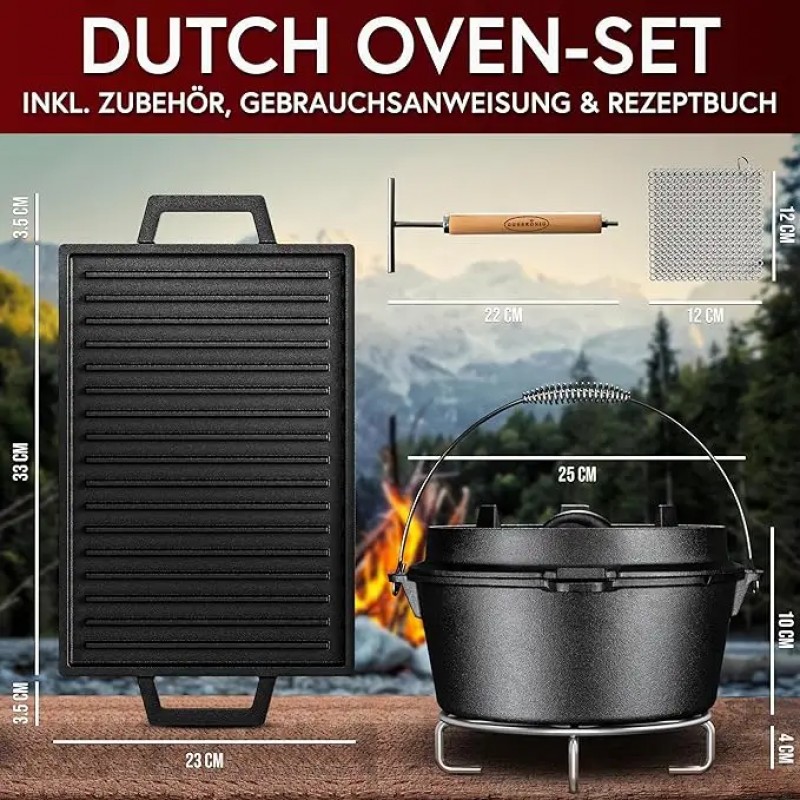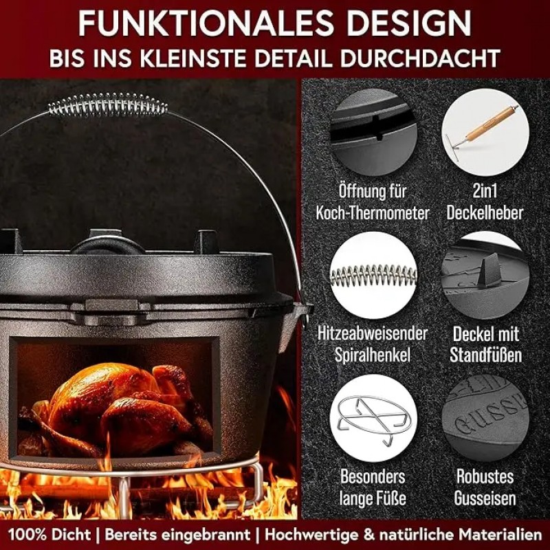 Голландская печь. крышка с ножками, подъемник крышки 2-в-1, щетка для чистки и книга рецептов