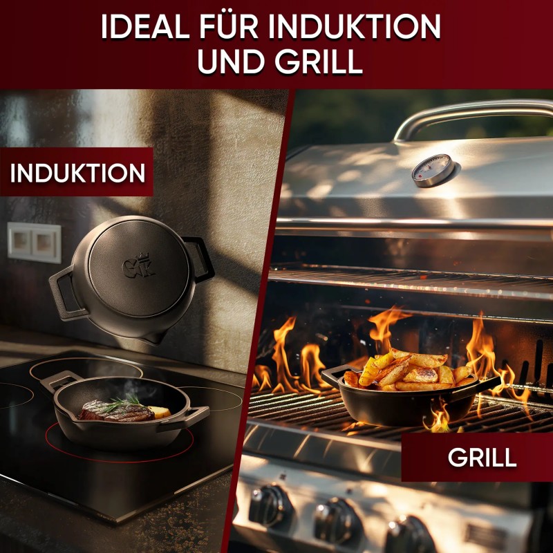 Носи, расположенные на чугунной кастрюле придают удобству, позволяя легко сливать лишнюю жидкость или соус без разбрызгивания. Они обеспечивают аккуратность при подаче блюд и минимизируют риск случайного пролития, что особенно полезно для густых соусов и супов. Набор включает в себя книгу рецептов, которая вдохновит на создание кулинарных шедевров и поможет максимально использовать кастрюли, что сделает набор отличным подарком для поклонников гриля и кулинарии в целом.