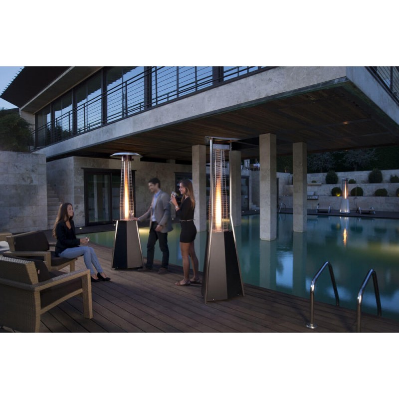 Газовые инфракрасные уличные обогреватели факельного типа со стеклянной колбой способны обогреть до 30 м² площади помещения, при условии отсутствия сильных сквозняков. При этом необходимо помнить, что при использовании в помещениях, должны оставаться открытыми и иметь прямой доступ к воздуху 25% от площади всех стен. Если вы планируете использовать Falo Evo Black на открытом воздухе, вам будет тепло в радиусе 1,5 – 2 метра от него. Еще один важный фактор – это эффективность обогрева. Уличные газовые обогреватели старого типа отражают тепло только от верхнего рефлектора, в то время, как обогреватели Falo Evo Black излучают тепло не только от верхнего рефлектора, а и от самой колбы, по всей ее длине, за счет использования специального боросиликатного стекла, из которого сделана колба.