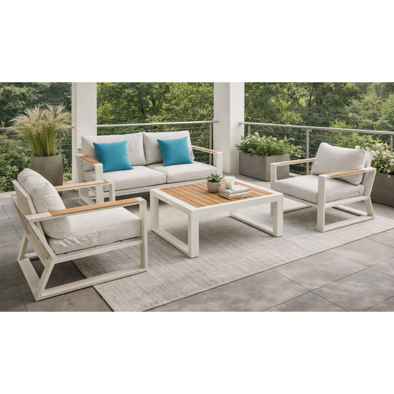 Столешница и детали на подлокотниках изготовлены из тика, который известен своей прочностью и стойкостью. Белые олефиновые подушки на диване и креслах – это не только стильный акцент, но и придают удобству вашему отдыху. Изготовленные из прочного материала, отталкивающего грязь и устойчивого к УФ-излучению, они сохраняют свой вид в течение длительного времени. Таким образом, набор Exee Lounge идеально подходит для использования на улице как для профессионального, так и личного использования.