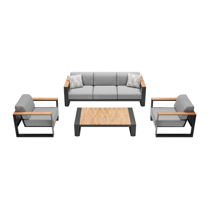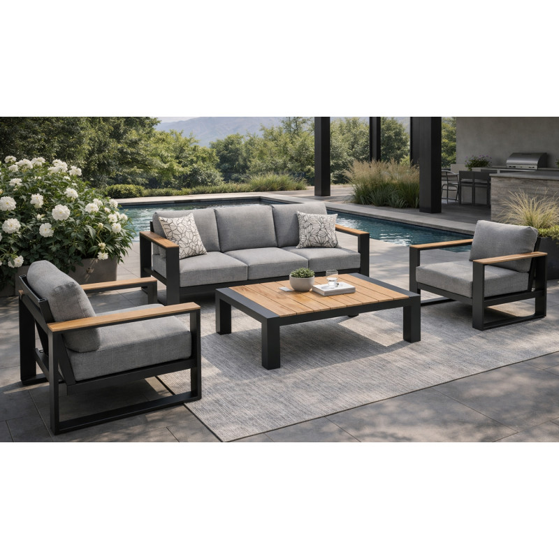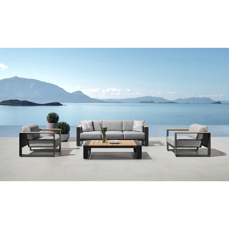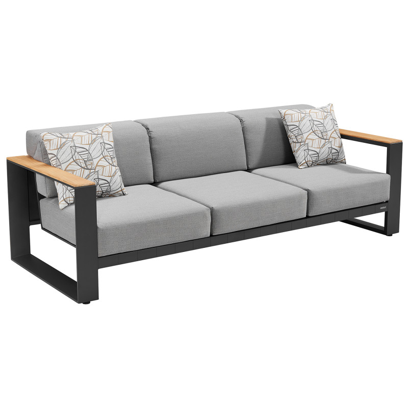 Материалы премиум-класса: Комплект изготовлен из высококачественного алюминия и прочного текстилена, что гарантирует долговечность и устойчивость к воздействию внешних факторов. Комфорт: Трехместный диван и два кресла оснащены мягкими подушками со съемными чехлами, которые легко очищаются и устойчивы к влаге и ультрафиолетовому излучению.