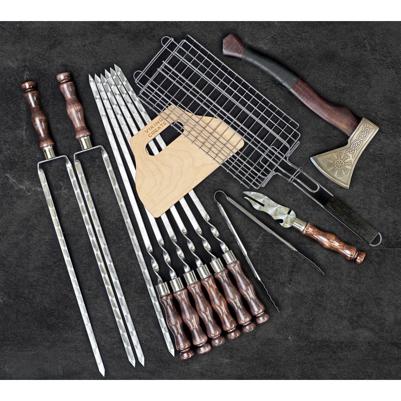 У комплекті є шампури з художнім литтям з бронзи, а також ексклюзивна сокира з травленням, що робить цей набір чудовим подарунком для будь-якого чоловіка. Всі предмети виготовлені з нержавіючої сталі, що гарантує їхню надійність і довговічність. Переваги набору шампурів та інструментів "Тор":