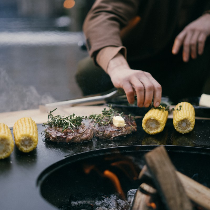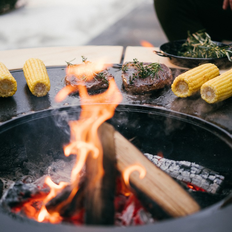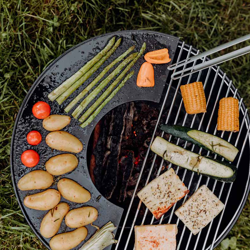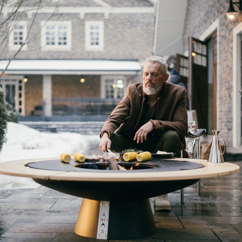 AHOS BIG SPHERE LOW оснащений великою поверхнею для смаження, діаметром 100 см. Створена з цільного шматка високоміцної товстої вуглецевої сталі, поверхня смаження чудово акумулює тепло, що значно знижує її температурні коливання. Загинання поверхні до центру вогнища забезпечує стікання зайвої олії у вогонь, де вона повністю згорає. Багато аксесуарів для гриля дозволяють значно розширити його функціональність. Додатково AHOS може бути укомплектований решіткою гриль, яка може бути встановлена на різних рівнях: нарівні з поверхнею для смаження та на підставці, на висоті 12 см від поверхні смаження. Також AHOS можна укомплектувати перехідними кільцями для установки котелка і насадкою для укладання класичних шампурів. Він не вимагає миття спеціальними засобами, а для очищення поверхні для смаження достатньо видалити залишки їжі шпателем і протерти поверхню рослинним маслом. Осередок легко чиститься від золи за допомогою знімного пеплозбірника.