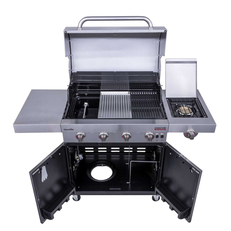 Інфрачервоний газовий гриль Char-Broil Signature 4 Burner не дає жиру спалахувати, а решітки завжди нагріваються рівномірно. Це дозволяє однаково чудово готувати будь-які страви. При цьому вони залишаються дуже соковитими всередині і з хрусткою скоринкою зовні. бургерів, рибку та овочі на гарнір. Тепер ви можете влаштовувати у себе на задньому дворі барбекю вечірки і не переживати про те, як приготувати велику кількість порцій одночасно. Для зручного та легкого переміщення гриля, він обладнаний чотирма колесами. А сам гриль виконаний із високоміцної сталі, яка робить його стійкішим до згубного впливу навколишнього середовища. Чиститься легко і відмінно тримає тепло. Для більш комфортного приготування в грилі є бічна полиця. На ній зручно готувати продукти до готування, сервірувати готові страви, а також зберігати все необхідне під рукою.