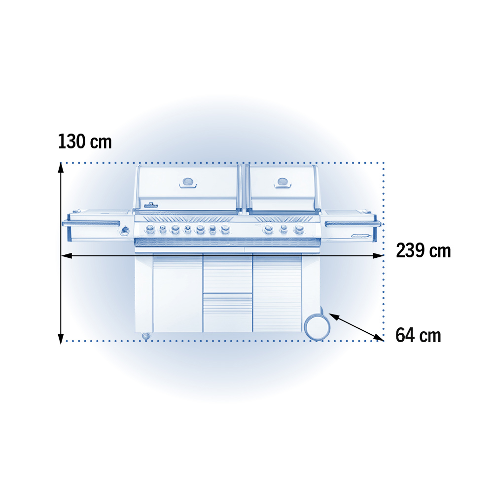 Ця модель може похвалитися великими розмірами. Нержавіючий корпус із хромованими елементами підкреслює вишуканий дизайн гриля. Ручки з підсвічуванням явно зробили панель управління сучаснішою та вишуканішою. А в закритих шафах вистачить місця для зберігання всього необхідного. Відмінна риса Prestige PRO 825 – легке та безшумне відчинення/зачинення дверей, воно досягається наявністю доводчиків. Також гриль має підсвічування камери та тумби. У комплекті йдуть два столики з боків. Один укомплектований двоступінчастим інфрачервоним пальником, інший отримав лоток для зберігання продуктів/льоду та обробну дошку. У комплекті із грилем йде висувна секція для копчення. Ви без особливих зусиль зможете зробити зі свого гриля коптильню!