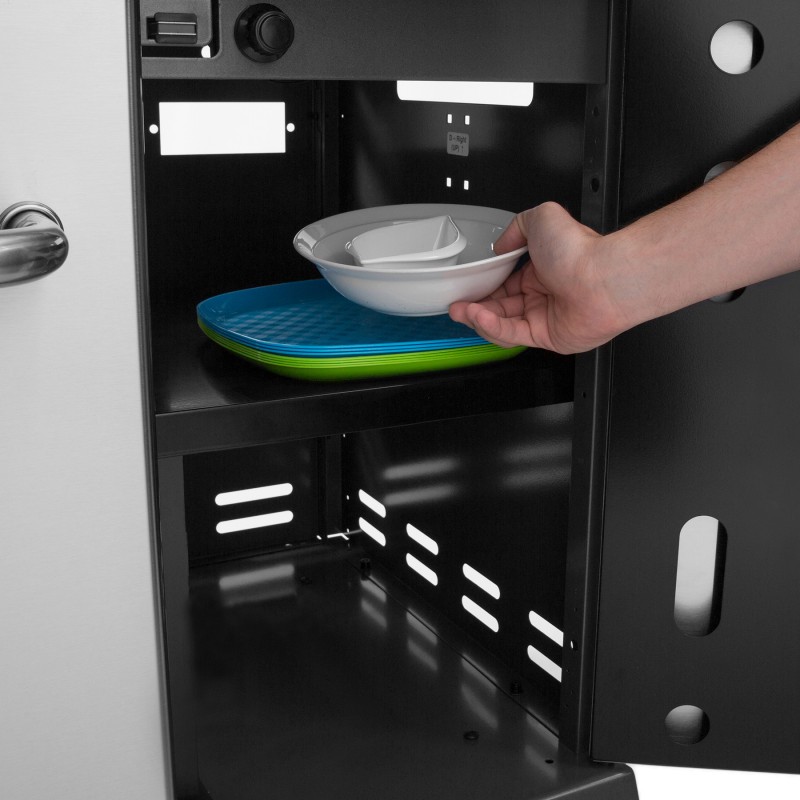 Гриль оснащений кришкою з подвійними стальними стінками з боковинами з литого алюмінію і міцними круглими ручками з нержавіючої сталі. Для зберігання балона, інструментів і продуктів передбачено 2 шафи з 3 дверцятами. З електроніки передбачено: підсвітка регуляторів і електропідпал пальників. Також має 6 коліщат зі стопами із міцного пластика у висоту 7,6 см і 3 ніжки для регулювання висоти з передньої сторони грилю.