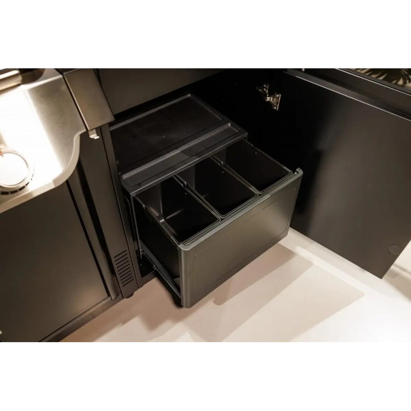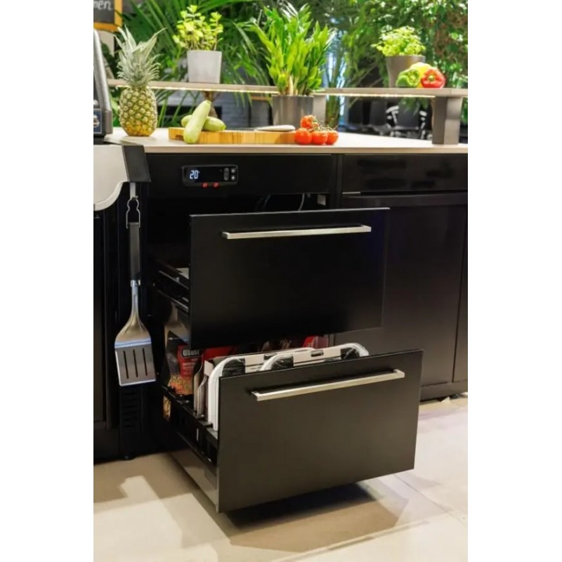 Він пропонує достатньо місця для зберігання газових балонів, а також для громіздких аксесуарів для барбекю або іншого обладнання. Існує також можливість легко та просто встановити холодильник (максимальний розмір: 598 (Ш) x 830 (В) x 560 (Г) мм, що надає вашій індивідуальній кухні барбекю ще більше переваг. Висота стільниці: від 930 до 995 мм - регулюється індивідуально. Розміри: 640 (Ш) x 611 (Г) мм - Шухлядний модуль