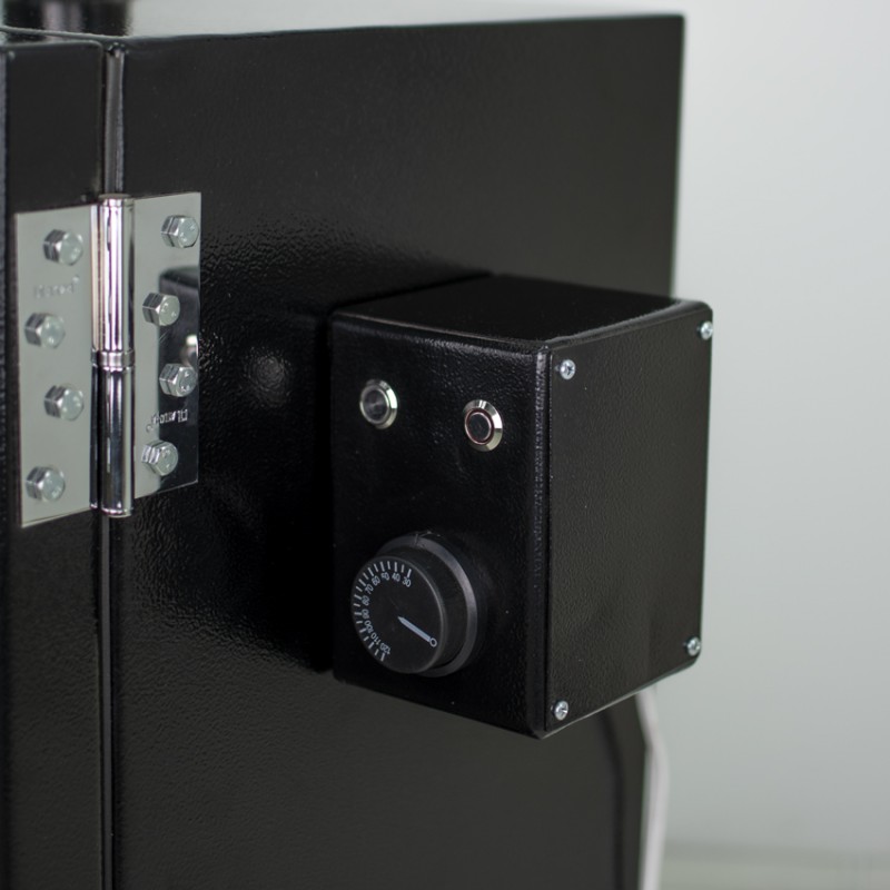 Всередині коптильня обшита нержавіючої сталлю, що продовжить термін її експлуатації та полегшує процес чищення. Стінки утеплені мінеральною ватою. Завдяки встановленій ТЕНе на 1кВт та терморегулятору, температуру для готування можна встановити від 30 до 120 градусів.