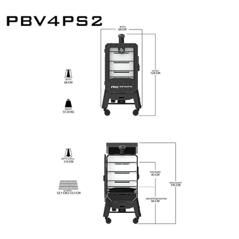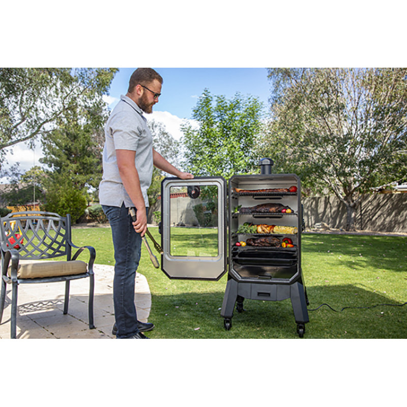 Сучасні функції, включаючи Wi-Fi і Bluetooth, дозволяють контролювати налаштування температури та моніторити процес приготування за допомогою додатку Pit Boss® SmokeiT™. Зручна мобільність завдяки чотирьом колесам робить його в ідеальному виборі для будь-якої події. Завдяки компактним розмірам, цей вертикальний гриль стане незамінним помічником для всіх поціновувачів смачного і якісного приготування їжі.