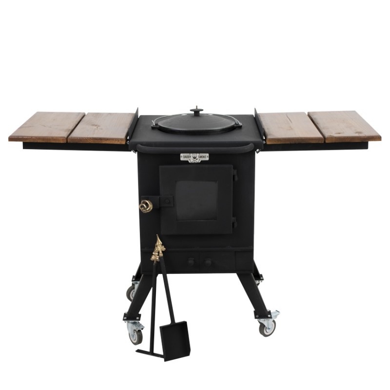 Піч укомплектована 2 бічними полицями з дерева для посуду, підготовки продуктів, кочергою та совком для видалення золи через отвір у нижній частині жаровні.