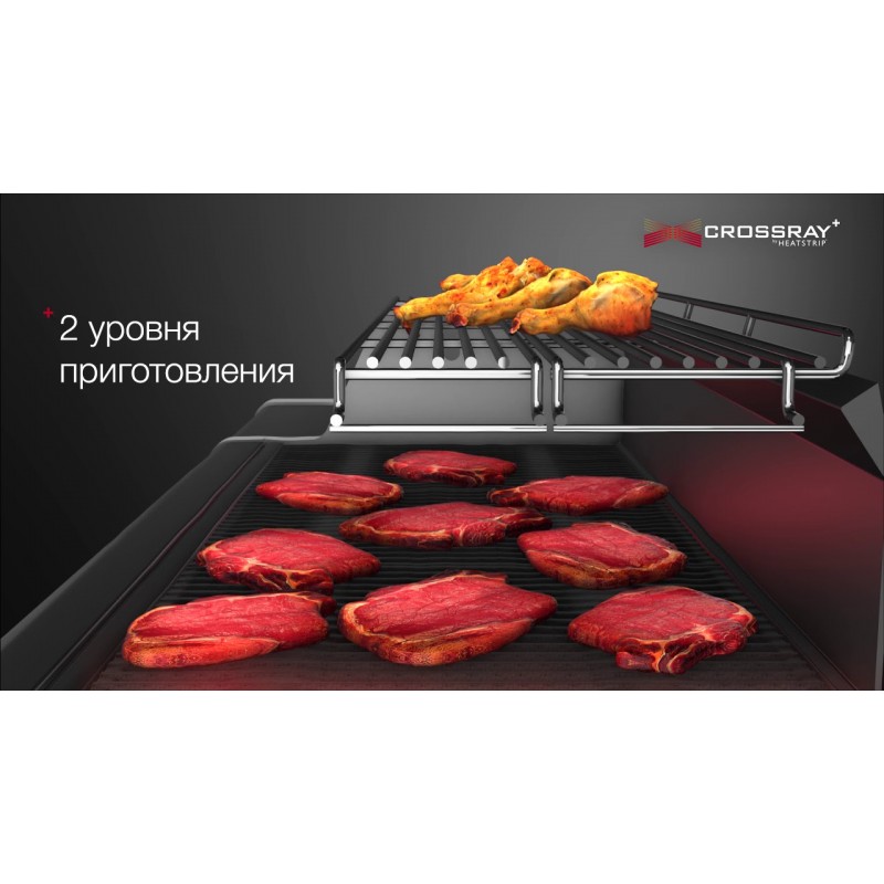 У технології Crossray+ використовуються високопродуктивні інфрачервоні пальники, щоб створити максимальну потужність і забезпечити абсолютно рівномірний розподіл тепла по всій робочій зоні. Інфрачервона теплова хвиля проникає глибоко в продукт, при цьому зберігає його соковитим усередині. Грилі з технологією CROSSRAY® забезпечують контрольований температурний режим в діапазоні від 110 °C до 400 °C, при цьому витрата газу на 50% менша, ніж у звичайного газового барбекю.
