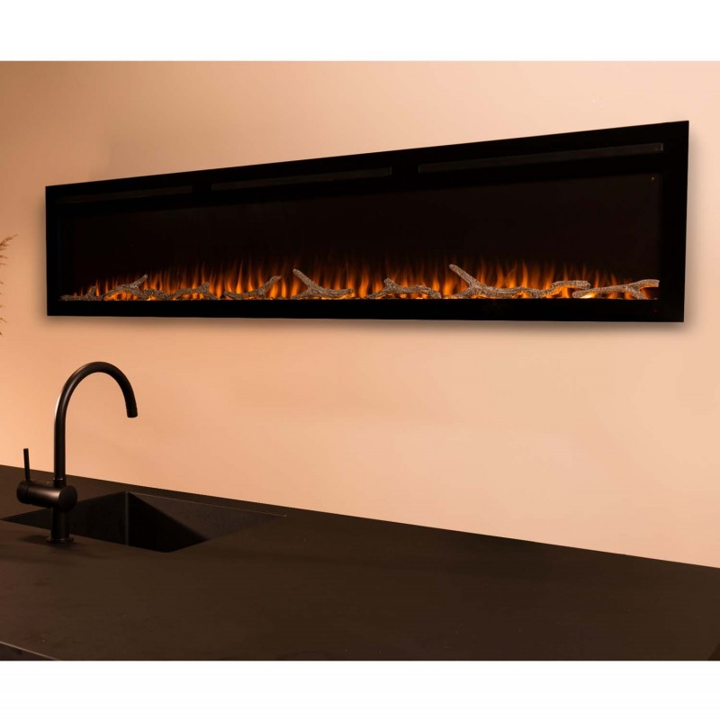 Основні характеристики. Маючи розміри 254 на 55 на 14 сантиметрів, електрокамін, що вбудовується в стіну, може монтуватися на стіну, що має вільний простір шириною 3-4,5 метра. Камін також характеризується: