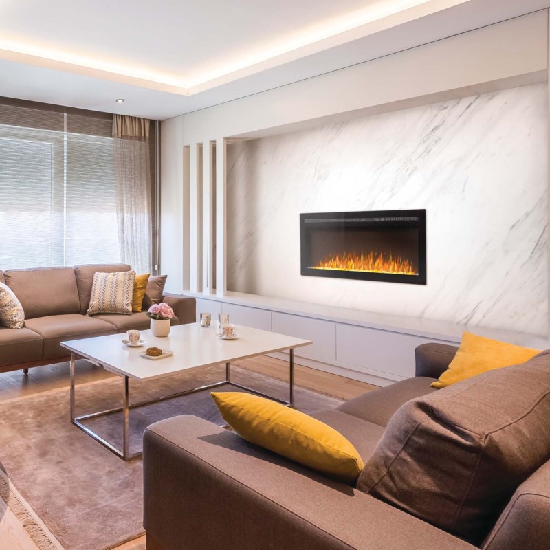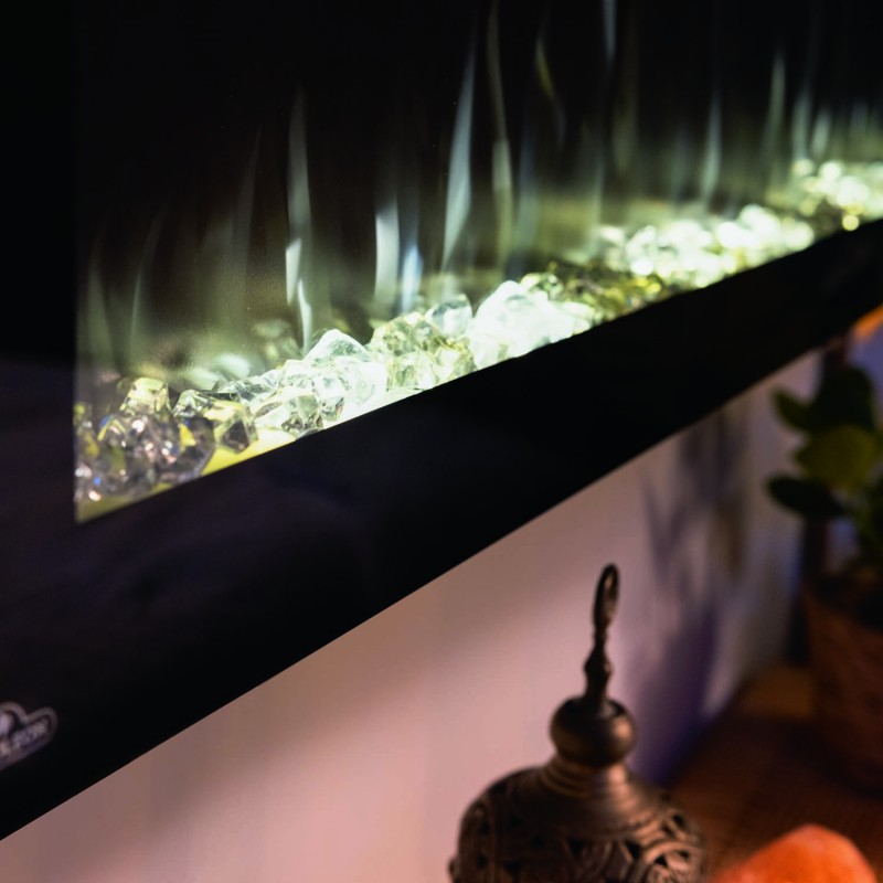 Електрокамін в сучасному стилі купити можна з додатковими аксесуарами, представленими елементами, що світяться, з темного кришталю і декоративними гілками дерева. Управління здійснюється за допомогою сенсорної панелі або пульта дистанційного керування.