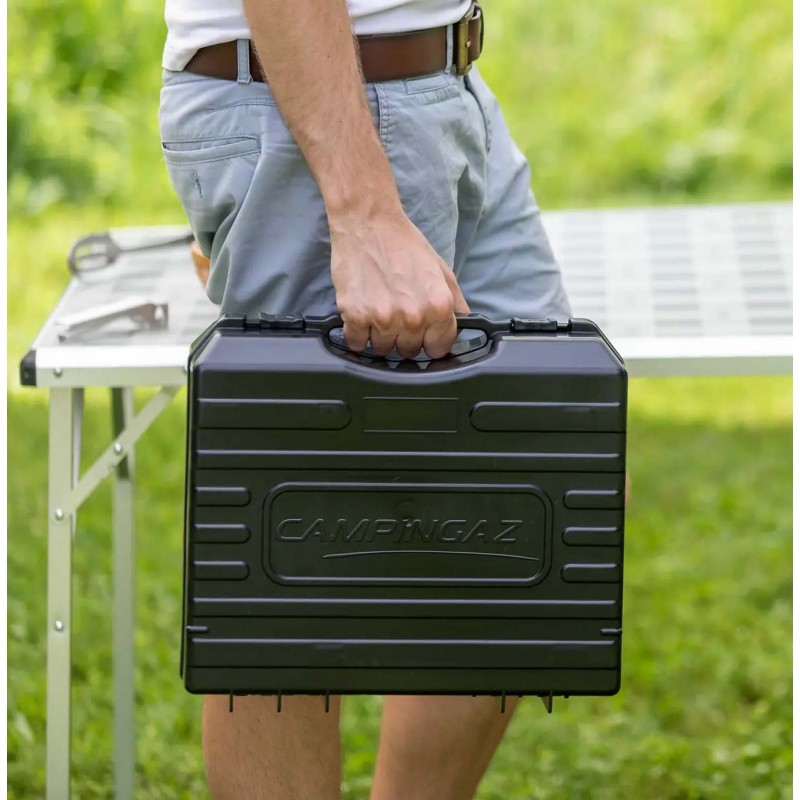 - Брендований пластиковий кейс. Який надійно фіксує вашу портативну газову плитку двома фіксаторами від випадкового відкривання кейсу.
