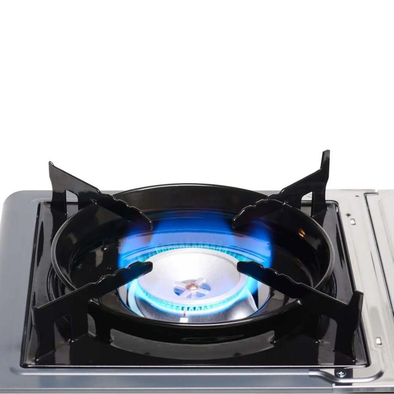 - Працює від цангового газового картриджа 220 г, який розміщується усередині плити
