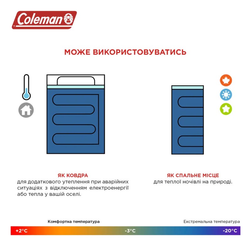 - - Можливість використання Coleman Hampton 220 Sleeping Bag у якості ковдри. При необхідності спальний мішок легко трансформується у ковдру, яка гарантовано зігріє вас у прохолодну погоду, а також може стати додатковим утепленням, якщо ви звикли спати під двома ковдрами вдома.